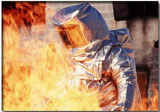 A fire proximity suit (also , silvers, silver bunker suit , or asbestos suit) is a suit designed to protect a firefighter from high temperatures , especially near fires of extreme temperature such as aircraft fires . They were first designed and used in the all time . Originally made of asbestos fabric , current models use vacuum-deposited aluminized materials .